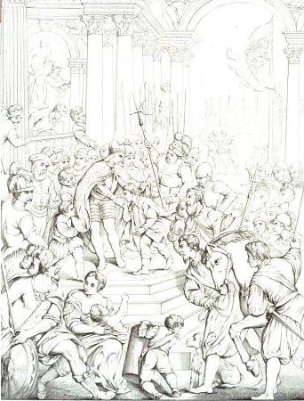 “Some struck him on the head with clubs, others befouled his nostrils with cow-dung, and still others, using sponges, poured excretions from the bellies of oxen and men over his eyes. Some, using foul language, reviled his mother and all his forebears. There were those who pierced his ribs with spits. The more shameless among them pelted him with stones and called him a rabid dog. A certain incontinent prostitute, grabbed an earthenware pot filled with hot water and emptied it over his face. There was no one who did not inflict some injury on Andronikos.”
